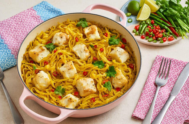 „Šis receptas sujungia tai, ko išmokau Tailande, su šeimos tradicijomis ir mano asmenine silpnybe – meile makaronams“, – sako „Bake Off“ laimėtoja Nadiya Hussain. „Patiekalas išeina aromatingas, sušildantis ir nuostabiai paprastas.“