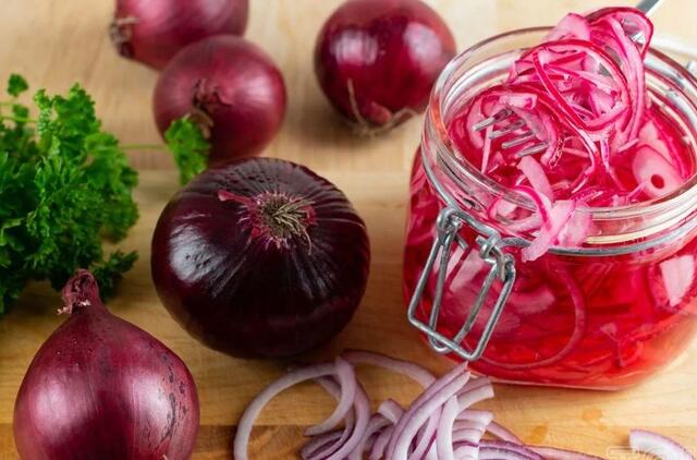 Daržovės ir prieskoniai, kurių galima pridėti pagal pageidavimą (lauro lapų, pipirų grūdelių, gvazdikėlių), suteiks marinuotiems svogūnams dar sodresnį ir įdomesnį skonį.