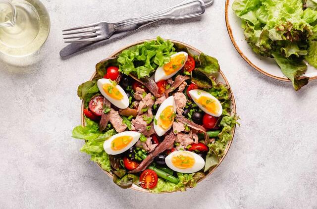 Reikės: 1 skardinės tuno aliejuje (apie 160 g), 4 kiaušinių, 200 g šparaginių pupelių, 300 g vyšninių pomidorų, 80 g juodųjų alyvuogių, 4 ančiuvių filė (nebūtinai), 2 šaukštų kaparėlių, saujų salotos lapų, 4 virtų bulvių. Padažui: 3 šaukštų alyvuogių aliejaus, 1 šaukšto citrinos sulčių, 1 šaukštelio garstyčių, 1 išspaustos česnako skiltelės, druskos, pipirų.