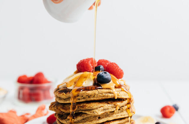 Sumažinkite kaitrą, jei per greitai ruduoja. Kepkite dar apie 2 minutes kitoje pusėje, tada patiekite. Papuoškite norimais priedais, tokiais kaip veganiškas sviestas ar daugiau žemės riešutų sviesto, banano ir šiek tiek klevų sirupo.