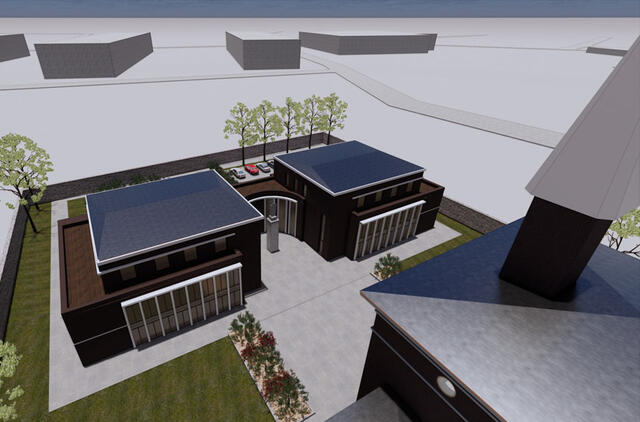 Projektuojamuose dviejų korpusų 3 aukštų parapijos namuose bus parapijos centras bei keturi butai. Šalia pastato bus įrengta 14 parkavimo vietų.