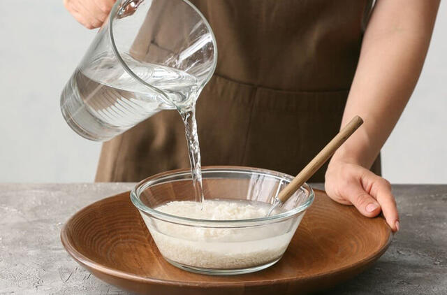 Žalius ryžius išmaišykite šiltame vandenyje ir palikite 45 minutes, tada vandenį perkoškite.