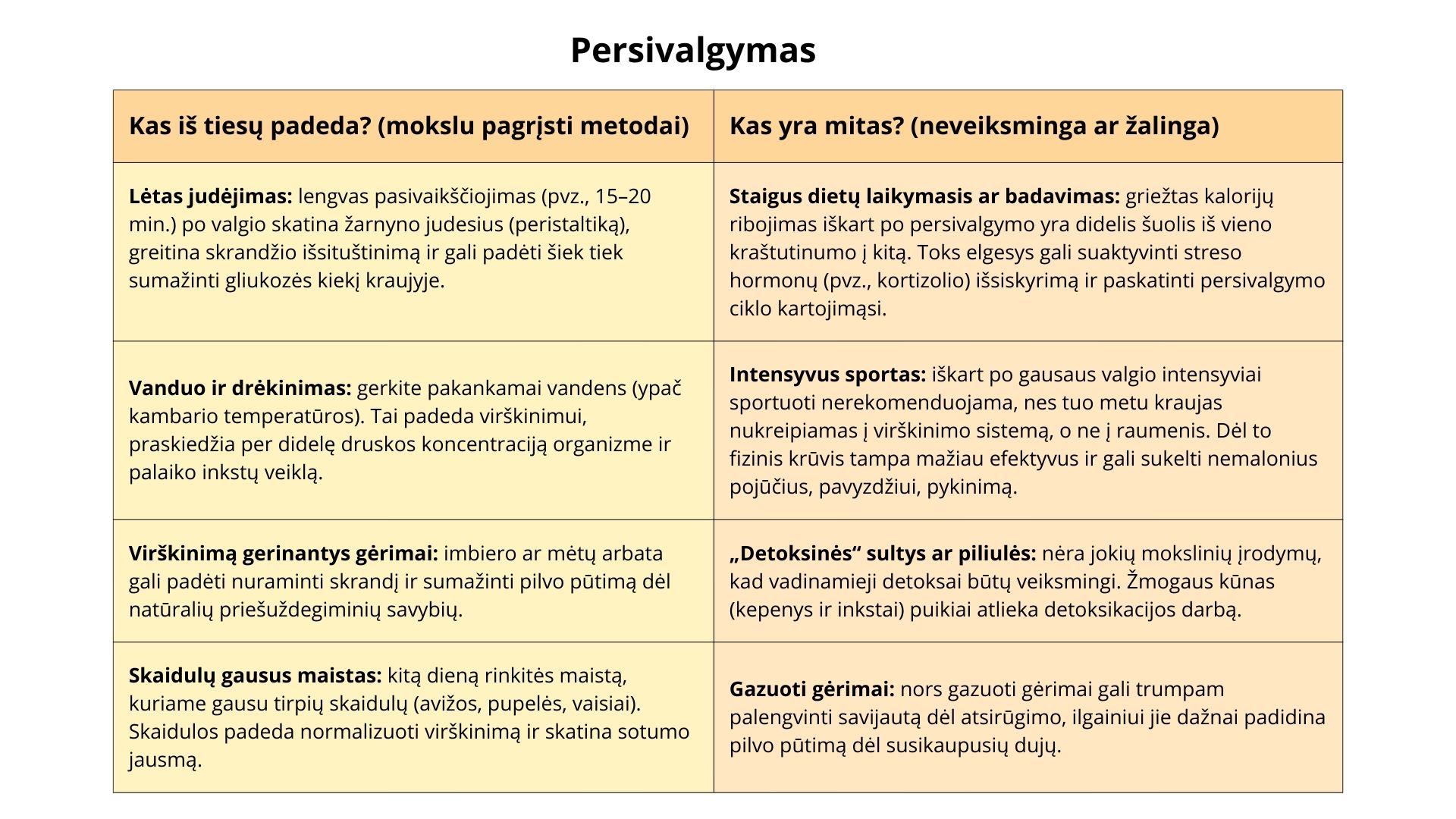 „Ankstyvesnė vakarienė (apie 17 val.) suteikia organizmui daugiau laiko suvirškinti didesnį maisto kiekį iki miego, todėl gali sumažinti naktinių virškinimo sutrikimų ir riebalų kaupimosi riziką.