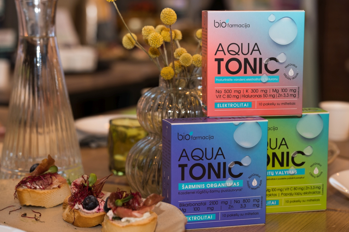 Lektorė pristatė tris „muškietininkus“ - BIOFARMACIJOS gaminamų aquatonicų naujienas. AQUATONIC yra maisto papildų linija, kurioje yra įvairių elektrolitų ir mineralų kompleksų, skirtų palaikyti organizmo skysčių, rūgščių-šarmų balanso ir energijos pusiausvyrą.