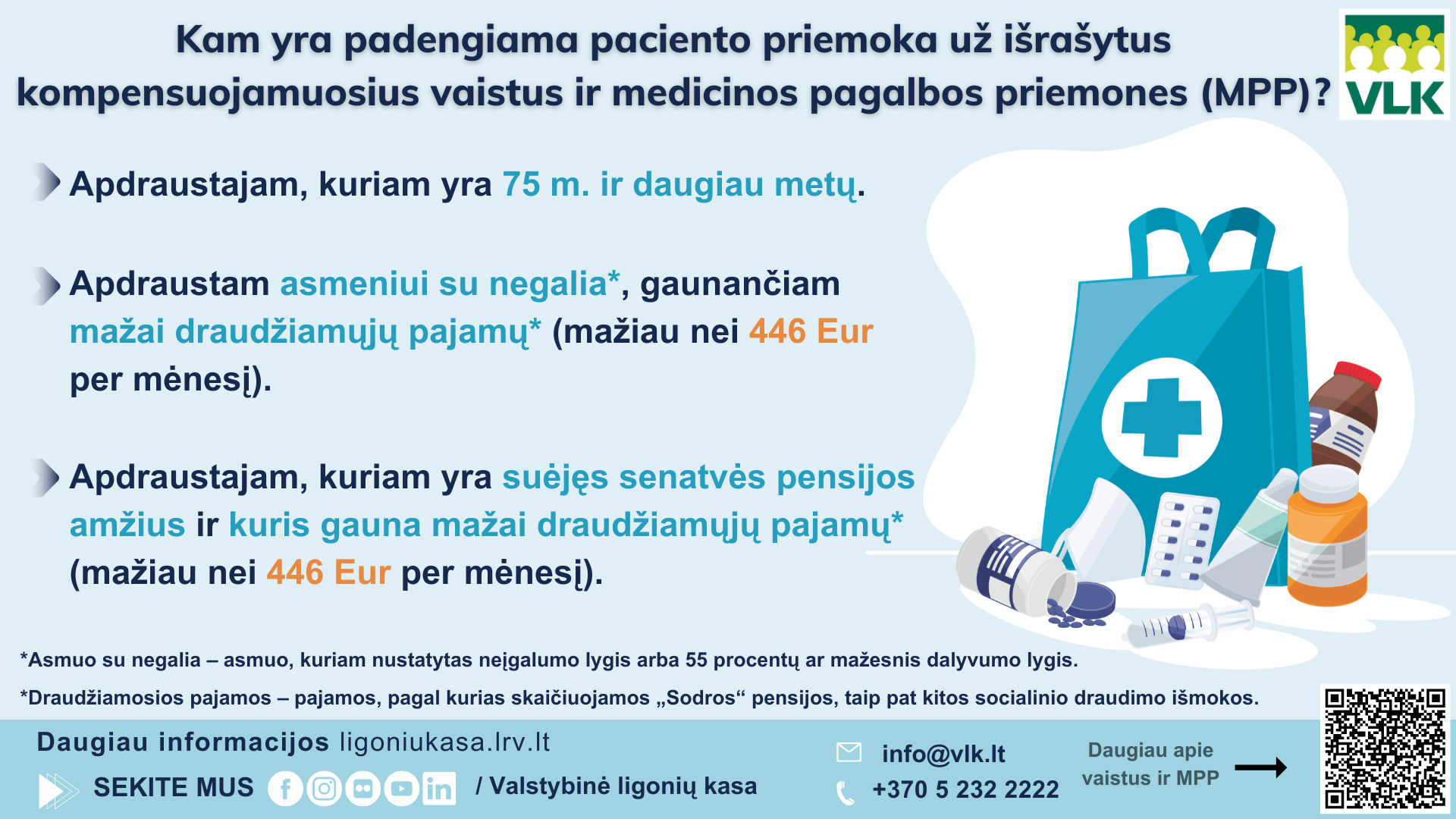 Nuo 2020 m. vidurio valstybės biudžeto lėšomis pradėta padengti pacientų priemokas už įsigytas MPP. Tai aktualu vyresniems nei 75 metų pacientams, pensinio amžiaus žmonėms ir asmenims su negalia, kurie gauna mažas pajamas. Dėl šios finansinės paramos pacientų išlaidos smarkiai sumažėjo. Pavyzdžiui, 2018 m. pacientai iš savo kišenės už šlapimo nelaikymo priemones sumokėjo 909 tūkst. eurų, o pernai šios išlaidos sumažėjo iki 666 tūkst. eurų – 37 proc. mažiau nei prieš penkerius metus. Valstybė, kompensuodama pacientams skirtas šių MPP priemokas, 2023 m. išleido 8,5 mln. eurų.