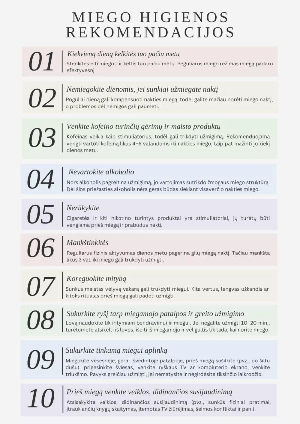 Anot dr. E. Sakalauskaitės-Juodeikienės, siekiant pagerinti miego kokybę, labai svarbu laikytis miego higienos rekomendacijų – taisyklių, nurodančių, kaip užtikrinti gerą miegą: „Miego higiena –