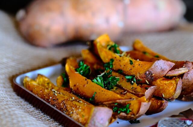 Saldžiosios bulvės. Oranžinės spalvos vaisiuose ir daržovėse, pavyzdžiui, saldžiosiose bulvėse, morkose, abrikosuose yra daug akims naudingo beta karoteno ir vitamino A.