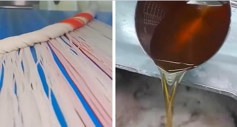 Ant išspaustų žuvies lakštų tepami raudoni maistiniai dažai. Jie sukuria iliuziją, kad gaminys turi krabų mėsos.