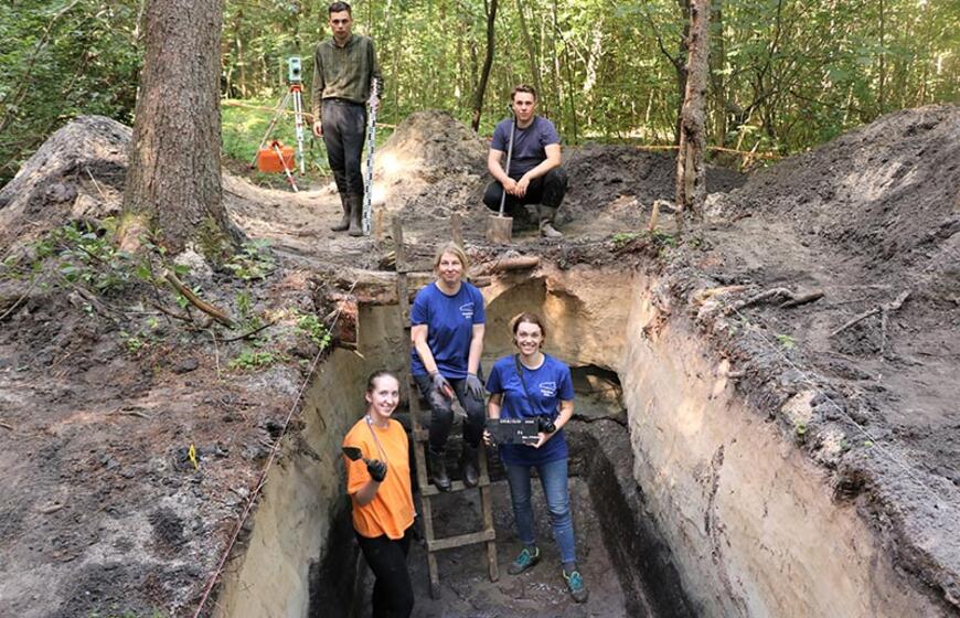 KU archeologų komanda, baigusi ketvirtojo sezono (2022 m.) tyrimus. Mėlynais marškinėliais – kasinėjimų vadovė dr. M. Urbonaitė-Ubė (dešinėje) ir jos kolegė dr. Elena Pranckėnaitė.