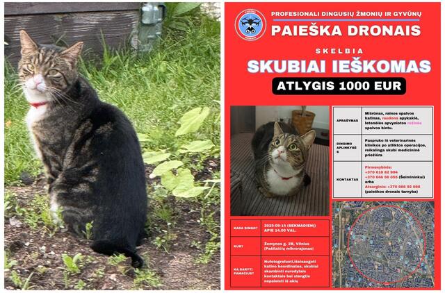 Dėl dingusio katino sostinėje – didelė paieškų operacija. Antradienį prie paieškos dronų kviečiami prisijungti ir savanoriai, o už dingusio augintinio radimą žadamas keturženklis atlygis.
