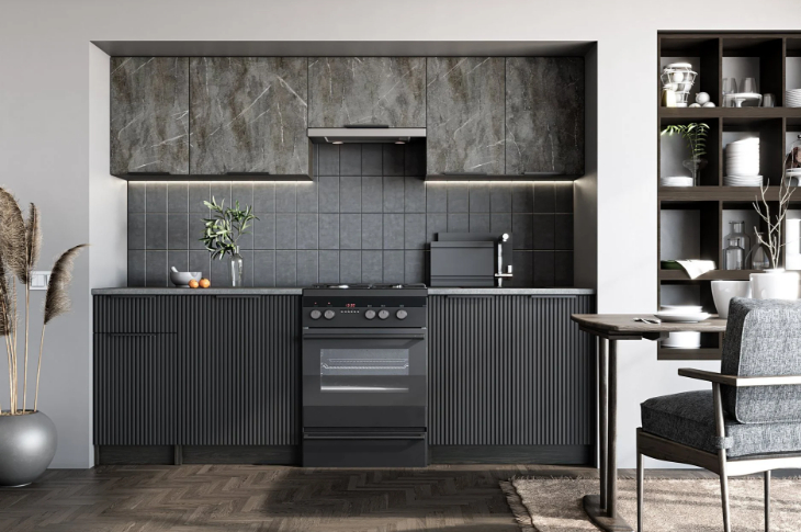 Šis virtuvės komplektas žavi solidžiu antracito, juodos ir pilkos spalvų deriniu, suteikiančiu erdvei šiuolaikišką pojūtį. Tamsių spalvų virtuvės baldai šiuo metu yra itin populiarūs.