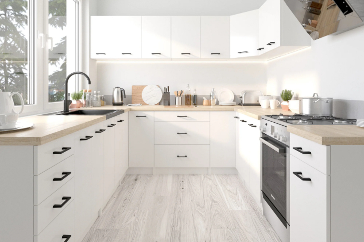 Balta spalva ir paprastas tiesių linijų dizainas suteikia ypatingą lengvumo įspūdį – išties puikus pasirinkimas nedidelėms virtuvėms.