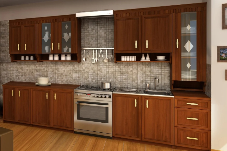 Jeigu siekiate susikurti klasikinį virtuvės interjerą, būtinai atkreipkite dėmesį į šį riešutmedžio spalvos modelį. Rudos spalvos virtuvės baldai suteikia namams daugiau natūralumo ir jaukumo, kadangi tai – nesenstančio dizaino pavyzdys, išsiskiriantis elegancija ir prabanga. O dekoruotos stiklinės durelių detalės kuria lengvumą ir subtilų puošnumą.