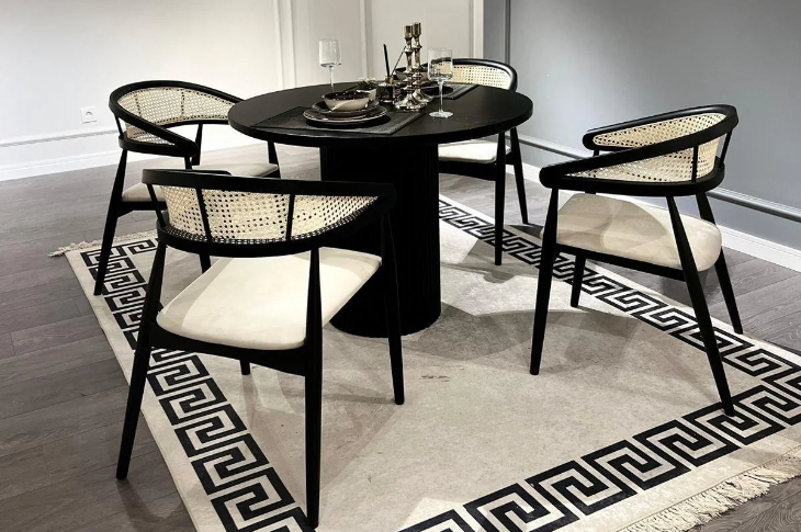 Savo virtuvėje norėtumėte kažko šiuolaikiško ir atkreipiančio svečių dėmesį? Susipažinkite su šiuo Kalune Design prekės ženklo valgomojo stalo ir kėdžių komplektu. Rafinuotos juodos ir šiltos smėlinės spalvos derinys atrodys elegantiškai ir jaukiai. Išskirtinės apvalios formos stalas bus ne tik patogus, bet ir taps stilingu virtuvės akcentu.