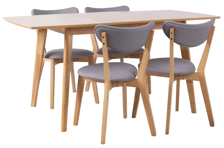 Galbūt ieškote tik paprasto valgomojo stalo su kėdėmis? Pristatome Home4you gamintojo modelį, kuris lengvai tiks daugelyje šiuolaikiškų virtuvių. Natūrali medžio spalva, pilko audinio kėdžių paminkštinimo detalės ir neapkrautas dizainas – tai idealus jaukaus interjero receptas.