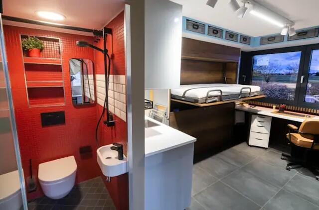 Viduje yra tualetas, dušas, virtuvė, keturios sulankstomos lovos ir ekranas, imituojantis langą su peizažais.