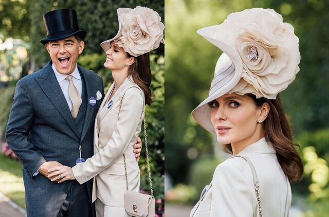 A. Valentaitė stebino savo stiliaus pojūčiu – moteris vilkėjo dailų smėlio spalvos kostiumėlį, prie kurio priderino iškirtinę ir itin prabangią „Philip Treacy“ skrybėlaitę.