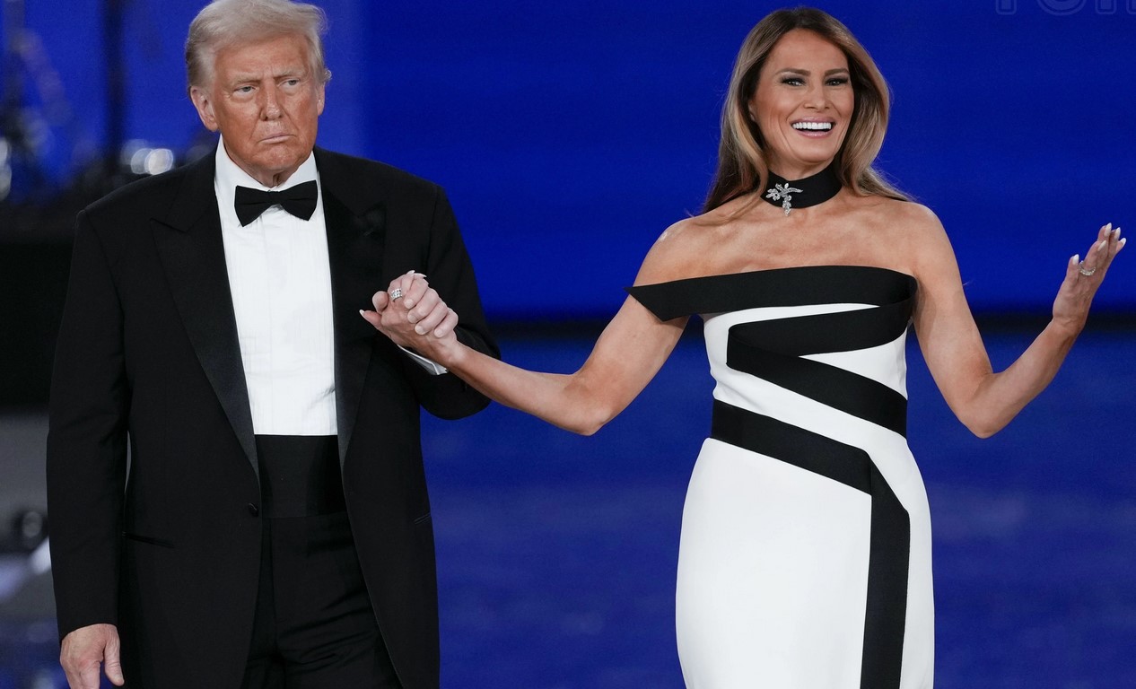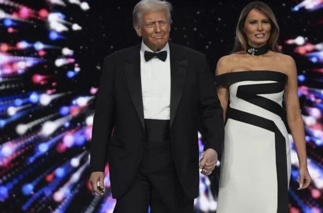 Baltai juoda suknelė ir skraistė ant kaklo: kaip Melania Trump atrodė per inauguracijos pokylį