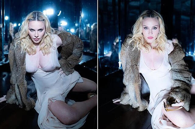 Popmuzikos karalienė atrodė nuostabiai – pasipuošusi gilia iškirpte permatoma suknele be liemenėlės ir tinklinėmis pėdkelnėmis. Įvaizdį ji papildė vintažiniu rudu Gucci kailiniu paltu ir auksiniais Gina aukštakulniais.
