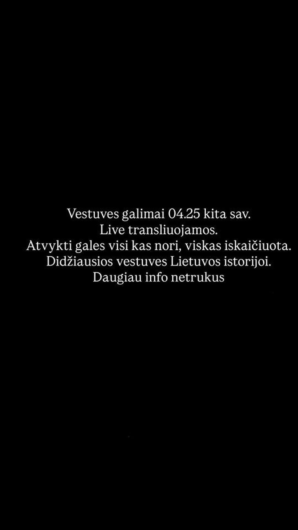 „Vestuvės galimai balandžio 25 d. live transliuojamos. Atvykti galės visi, kas nori. Viskas įskaičiuota. Didžiausios vestuvės Lietuvos istorijoj. Daugiau informacijos netrukus“, – intrigavo D. Dirkstys.