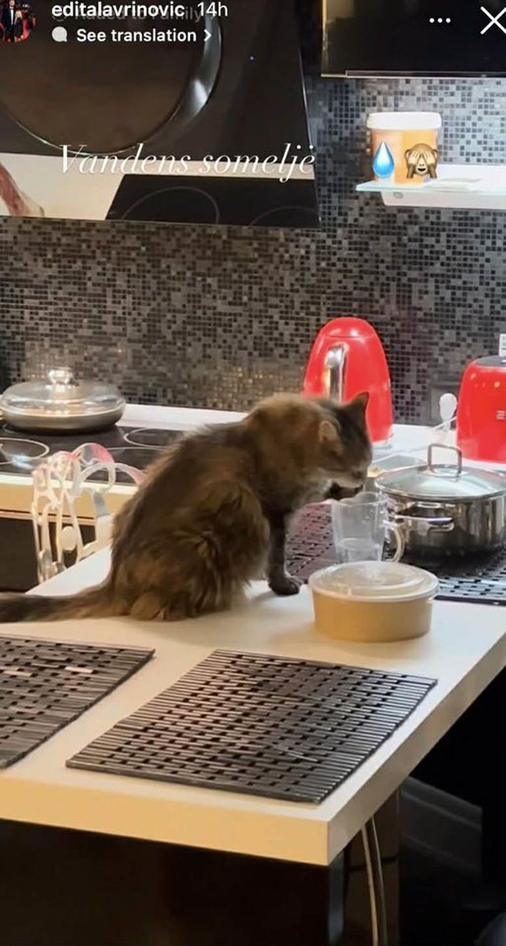 Vaizdo įraše matyti, kaip šeimos katė užlipusi ant stalo iš puodelio ragauja vandenį.