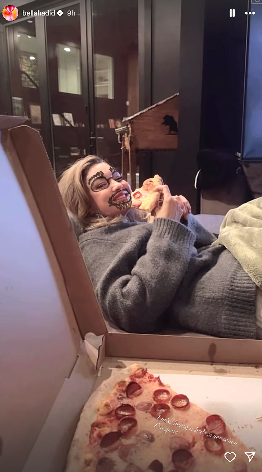 Vaizdo įraše matyti, kaip Gigi, vilkėdama sportinius drabužius, sėdi ant sofos, šypsosi ir valgo picą. Abi seserys apsigaubusios pledais, ilsisi ir žiūri televizorių.