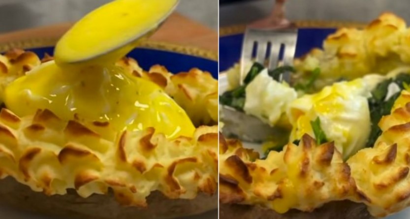 Patiekalas buvo paprastas ir sotus. Kiaušinis buvo patiekiamas ant bulvių pagalvės su špinatais ir olandišku padažu, rašo express.co.uk.