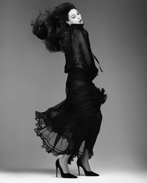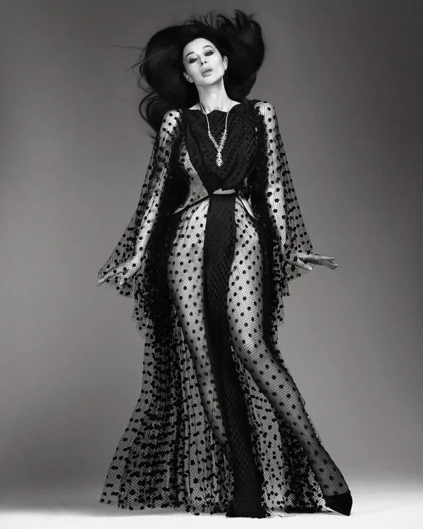 Žymaus ispanų fotografo Jesuso Isnardo objektyvu 60-metė garsenybė vilkėjo juodą ansamblį, kurį sudarė permatomas ilgas sijonas ir tokia pat permatoma juoda Yves Saint Laurent palaidinė.