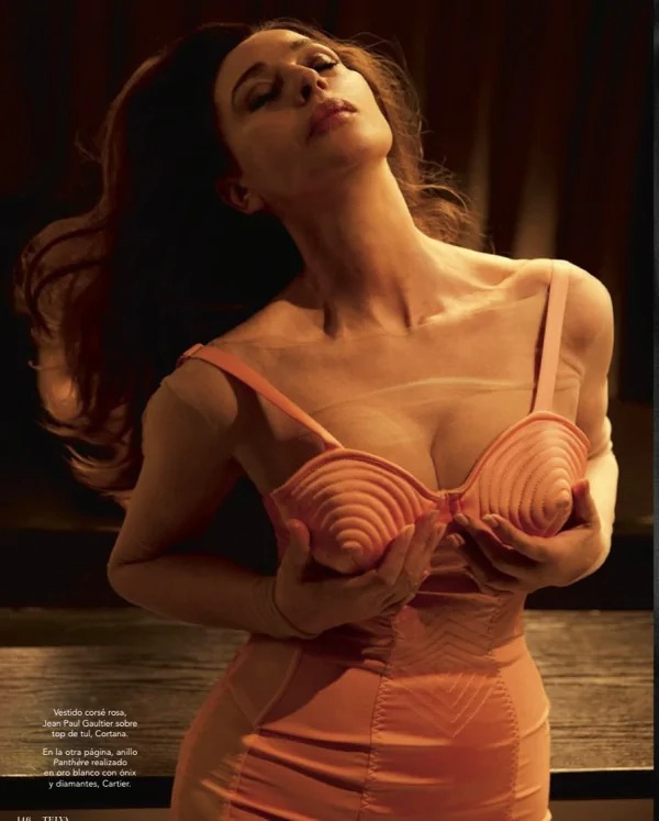Per fotosesiją Monica taip pat išbandė oranžinę Jean Paul Gaultier suknelę su garsiuoju kūgio formos liemenėle.