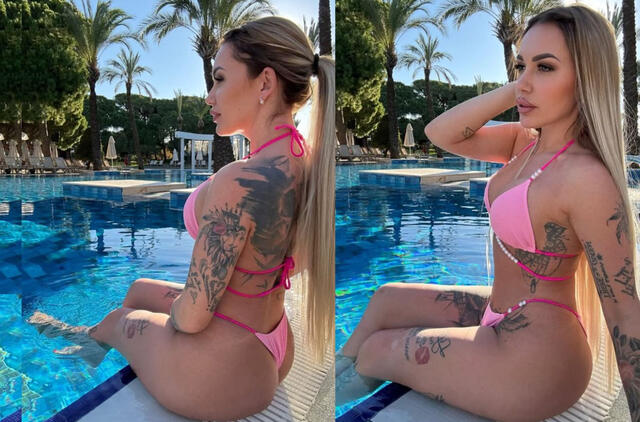 Tik su rožiniu maudymosi kostiumėliu pozavusi J. Partikė atidengė kūną – pademonstravo savo figūros linkius ir kūną puošiančias tatuiruotes.