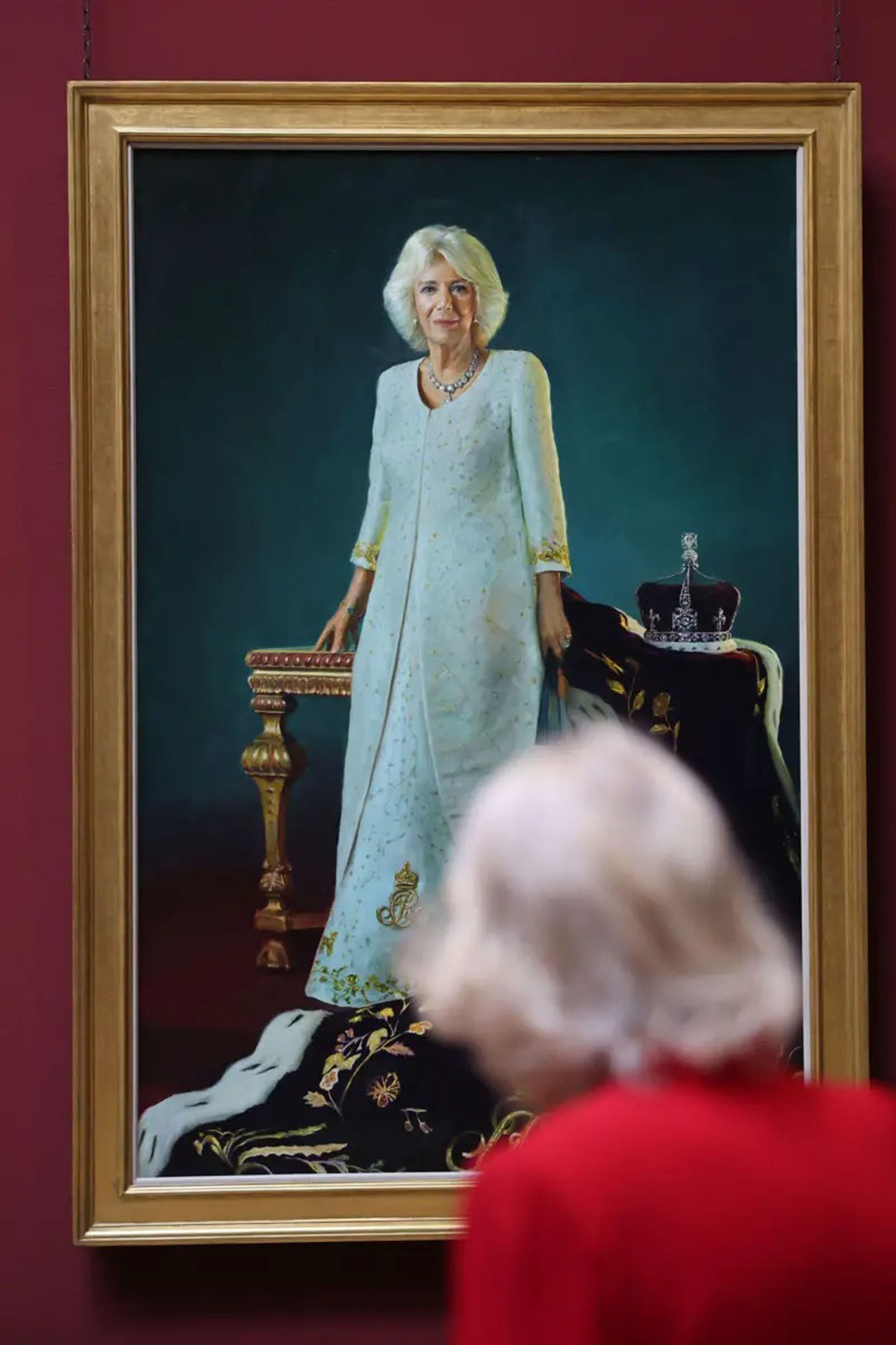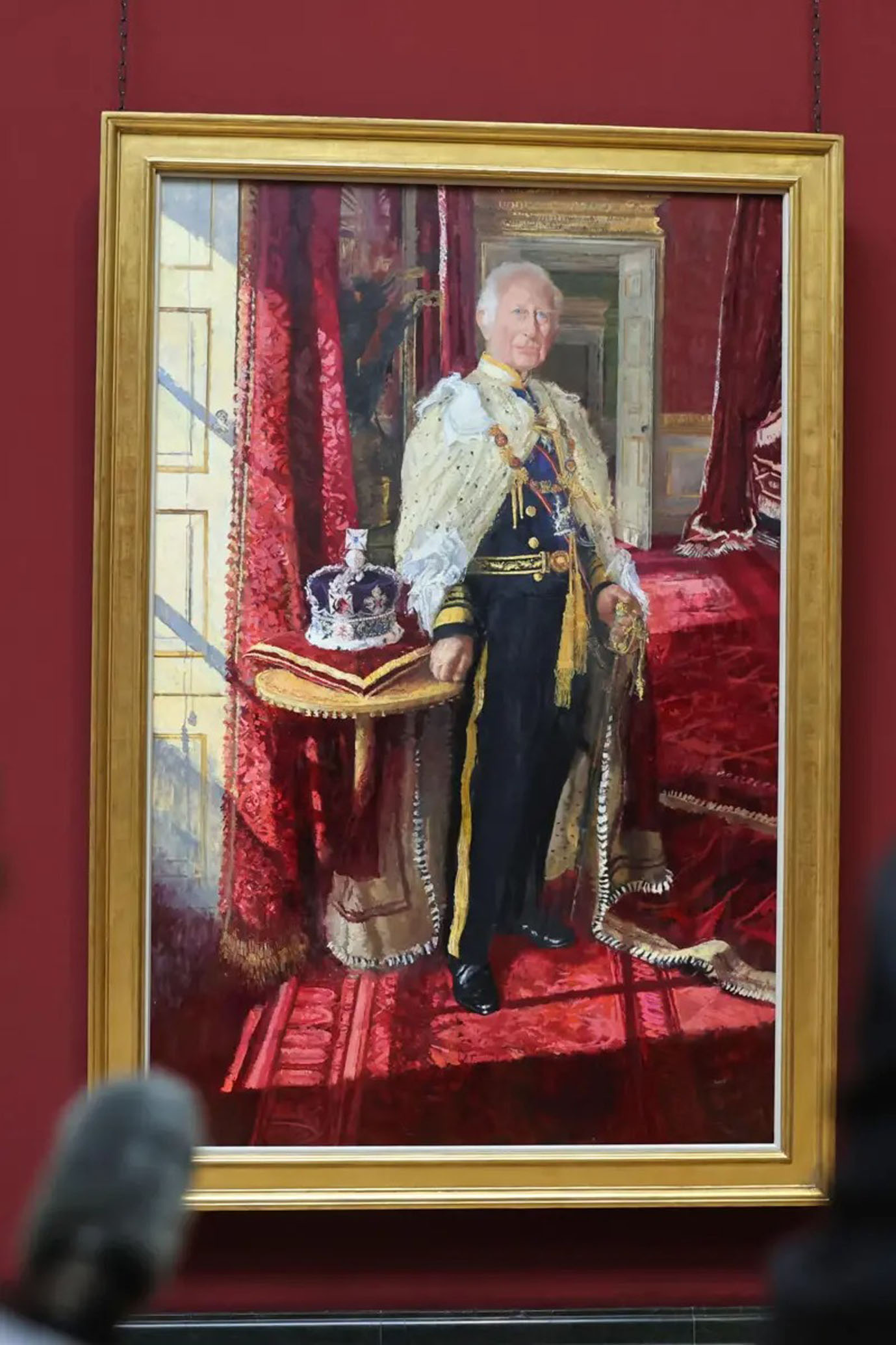 Karalius Čarlzas pavaizduotas su monarcho rūbais ant paradinės Karališkojo jūrų laivyno karininko uniformos, ant krūtinės - didieji apdovanojimai, o karalienė - su šviesiai turkio spalvos karūnavimo suknele.