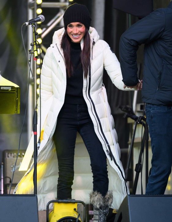 Meghan pasirodė vilkėdama kreminį „Calina maxi“ paltą „Mackage“, pagamintą iš perdirbtų pūkų, dėvėjo juodus aptemptus džinsus, juodą megztinį aukštu kaklu ir juodą kepuraitę.