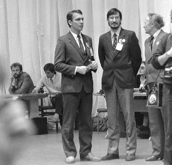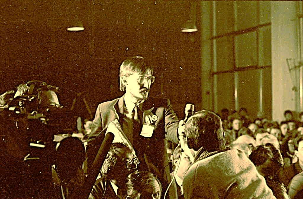 Lietuvos Persitvarkymo Sąjūdžio steigiamasis suvažiavimas Vilniaus sporto rūmuose.Kalba Estijos Liaudies fronto atstovai Martas Tarmakas ir Edgaras Savisaaras. Autorius Roma Beliajevienė