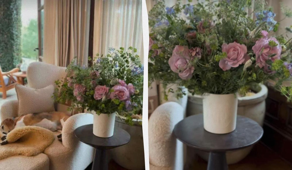 Pasidalindama vaizdo įrašu savo „Stories“ paskyroje su 4,2 milijono sekėjų, dviejų vaikų mama parodė elegantišką gėlių kompoziciją ir savo biglį Mia, miegantį ant nuostabaus kreminės spalvos fotelio ir prie jo priderinto minkšto pufo.