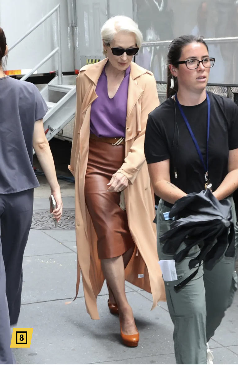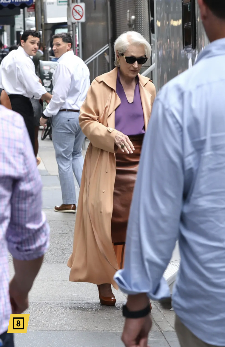 Streep buvo nufotografuota Niujorko Midtown rajone – ji vilkėjo chaki spalvos paltą, rudą pieštuko formos sijoną su diržu, violetinę palaidinę ir derančius aukštakulnius.