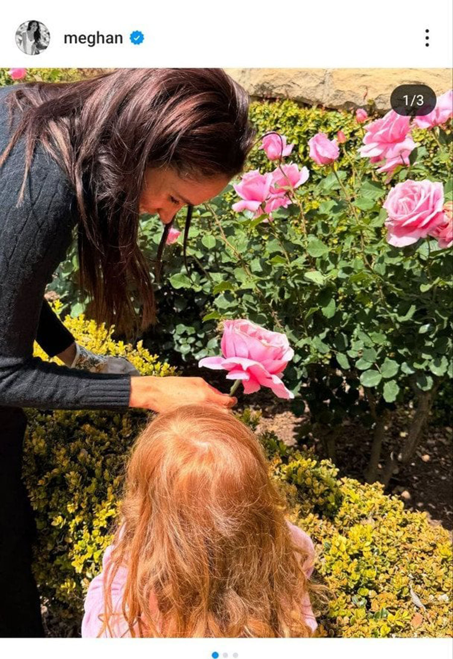 Princo Harry žmona įtraukė tris nuotraukas, pirmojoje ji šypsojosi, glostydama didelę rožinę gėlę su Lilbet šalia savęs.