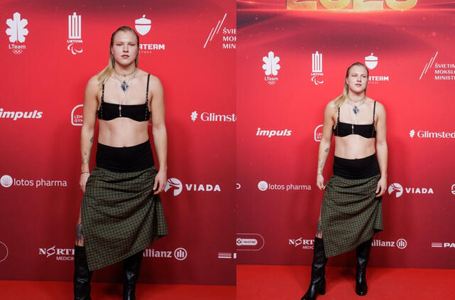 Ant raudonojo kilimo R.Meilutytė pasirodė pasipuošusi jai nebūdingai. Dažniausiai juodus kostiumus per apdovanojimus vilkėjusi plaukikė juos iškeitė į... originalią juodą liemenėlę ir parodė savo pilvo presą.