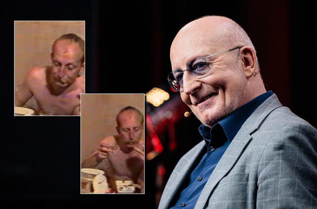 Prie stalo sėdintis Arūnas vaizdo įraše nevilki marškinėlių ir užkandžiauja.