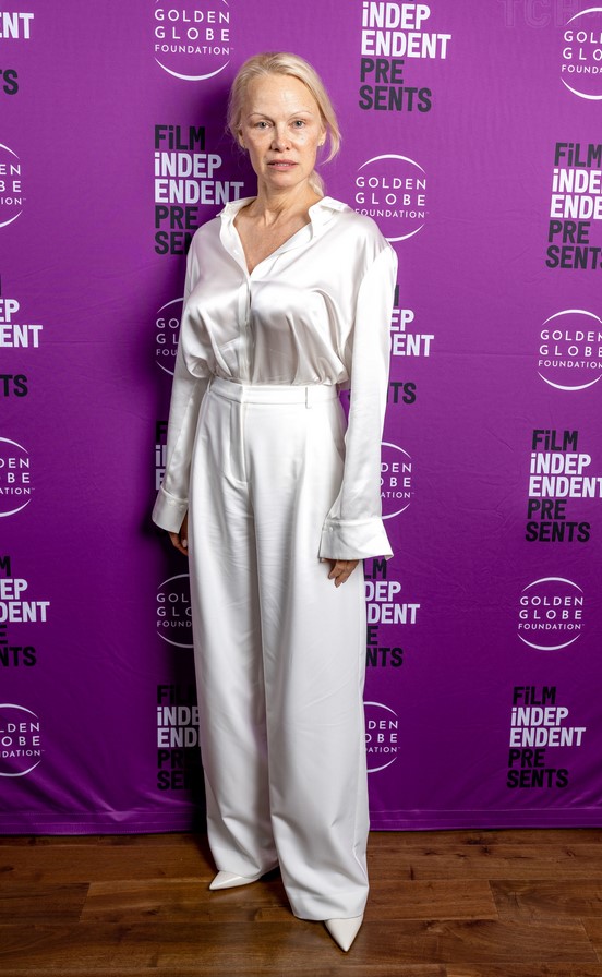 Pamela į šou atvyko vilkėdama pieno baltumo paltą, juodas odą aptempiančias pėdkelnes ir avėdama lakuotus aukštakulnius batelius.