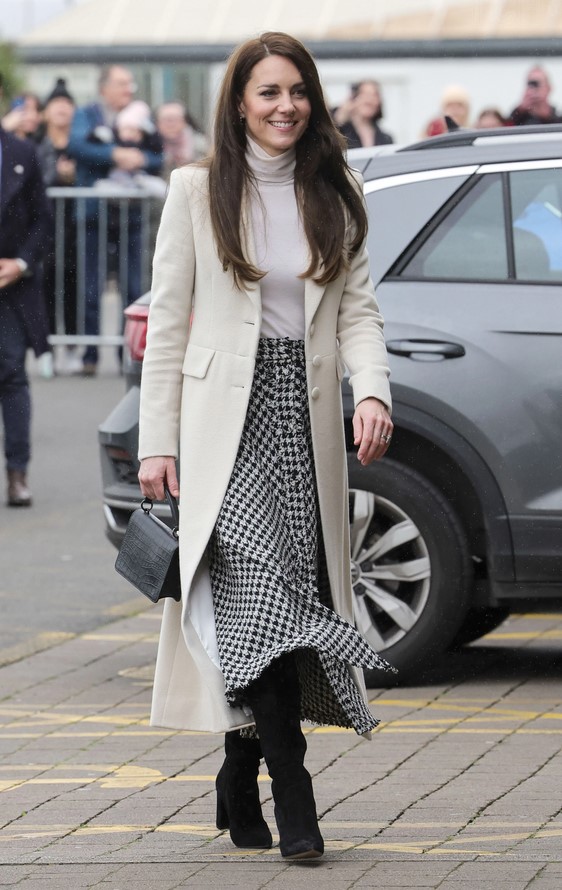 Išvykai Kate pasirinko pagal užsakymą pasiūtą paltą „Blaze Milano“ ir batelius „Russell & Bromley“, o savo įvaizdį papildė „Asprey“ rankine „Morgan“.