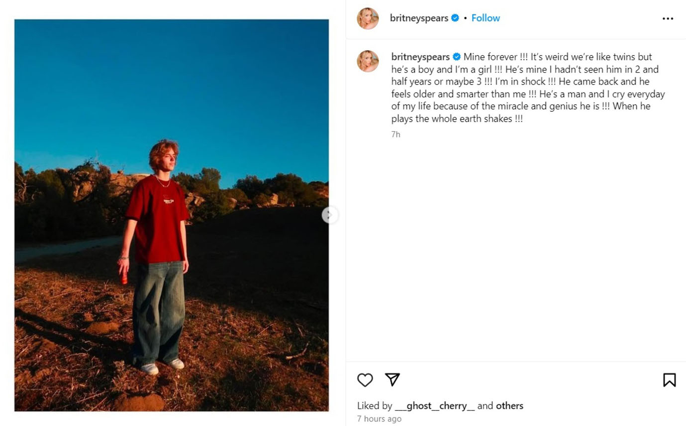 „Mano amžinai! Keista, kad esame tarsi dvyniai, bet jis - berniukas, o aš - mergaitė! Jis mano, nemačiau jo 2,5 metų, o gal 3! Esu šoke! Jis grįžo ir jaučiasi subrendęs ir protingesnis už mane! Jis yra vyras ir aš verkiu kiekvieną savo gyvenimo dieną dėl to, koks jis stebuklas ir genijus! Kai jis groja, dreba visa žemė!“ - nuotraukos antraštė.