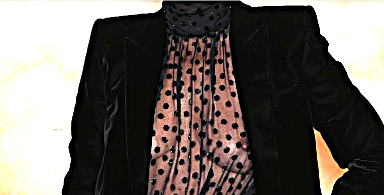Kate renginyje vilkėjo originalią juodą aprangą, kurioje derėjo visiškai permatoma taškuota palaidinė, laisvos kelnės ir aksominis švarkas.