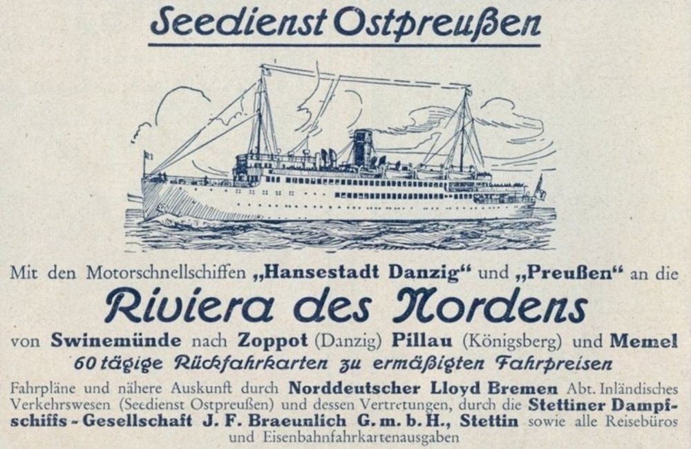 Reklama, viliojanti garlaiviu "Hansestadt Danzig" leistis į "Šiaurės rivjeros" kruizą nuo Swinemündės Pomeranijoje iki Klaipėdos Rytprūsiuose.