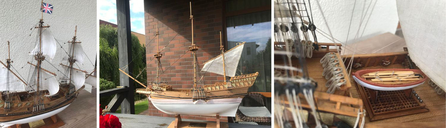 „Atrodo, kas čia yra, truputį paremontuosiu. Bet kai kurių dalykų negali suremontuoti neišardęs daugelio kitų dalykų. Jeigu atsilupo kokios nors burlaivio detalės, reikia nuimti virves, kad galėtum jas priklijuoti, o paskui virves iš naujo pritvirtinti. “Mayflowerio" lakas buvo jau papilkėjęs, dažai suskeldėję. Nuo kai kurių vietų teko jį nuimti. Aš vietoj lako dažniausiai naudoju parafino aliejų, kuris labai gerai atgaivina medienos spalvą.