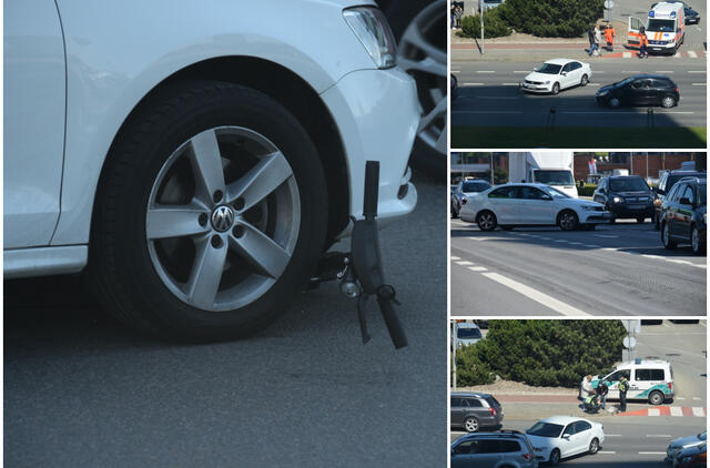 "Volkswagen Jetta" elektrinį paspirtuką, kartu su vairuotoja, nubloškė iki vidurinės Taikos prospekto eismo juostos.