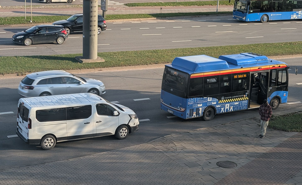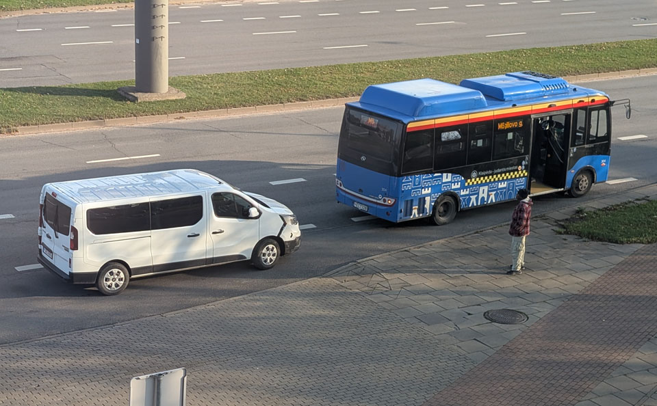 Į M6 maršrutu kursuojantį elektrinį autobusą „King Leon“ trenkėsi jam iš paskos važiavęs mikroautobusas „Renault Traffic“, panašu, kad abiejų transporto priemonių vairuotojai nesutaria dėl kaltės.