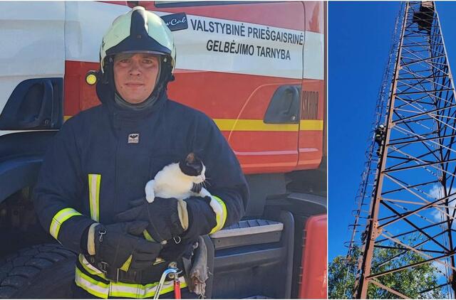 Katinui drąsos užteko tik užlipti į seną radijo ryšio bokštą: nukelti teko ugniagesiams gelbėtojams