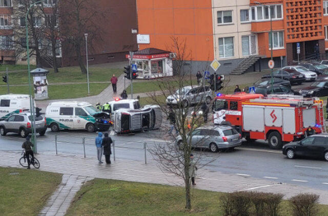 Klaipėdoje po susidūrimo su policijos automobiliu ant šono atgulė „Nissan“