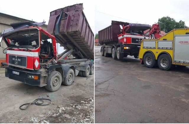 Labai sunkią (apie 10 tonų) gelžbetoninę konstrukciją nukėlė iškviestas kranas, įmonės traktorius patraukė sunkvežimį.