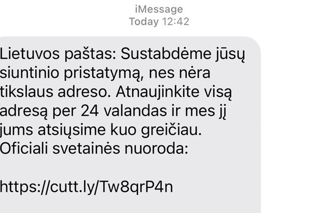 Trumpųjų žinučių į savo telefonus, kuriose dažniausiai pranešama apie neva sustabdytą siuntos pristatymą dėl netikslaus adreso, gyventojai sulaukia kone kasdien. Žinutėje prašoma atnaujinti adresą per 24 valandas, paspaudus sukčių suformuotą nuorodą.